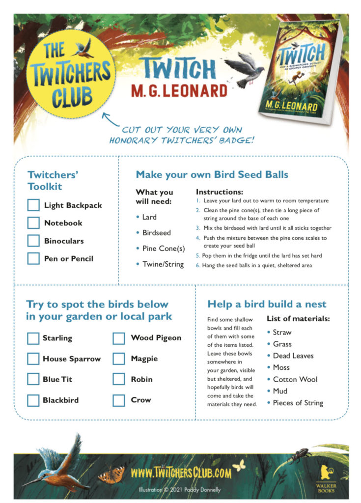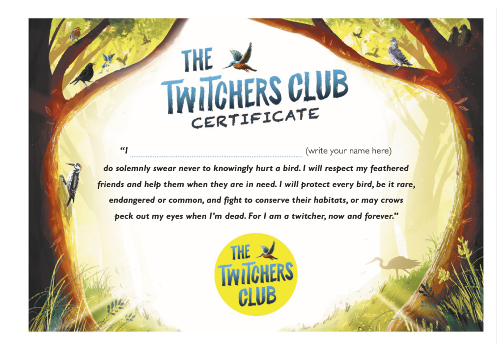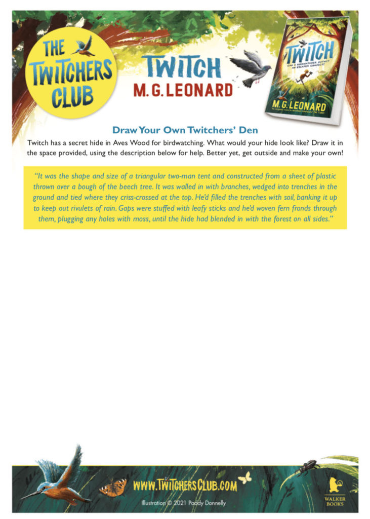 Activities Home The Books Activities Videos Schools The Author Newsletter Want to learn more about birds and how to be a Twitcher? Discover our brilliant activities below, and print out your own Twitchers Club certificate to show your dedication to helping our feathered friends! The Twitchers Club Activity Pack The Twitchers Club Certificate Map of Aves Woods